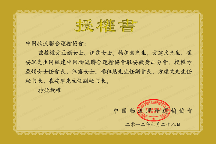 中国物流联合运输协会黄山分会授权书