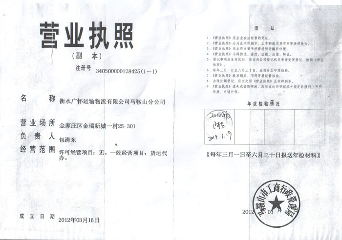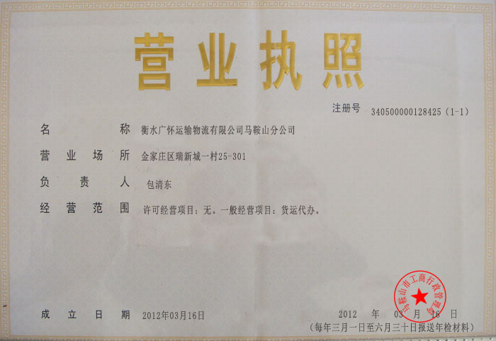 衡水广怀运输物流有限公司马鞍山分公司营业执照(正本) 衡水广怀运输物流有限公司马鞍山分公司营业执照(副本) 衡水广怀运输物流有限公司马鞍山分公司税务登记证 衡水广怀运输物流有限公司马鞍山分公司组织机构代码证
